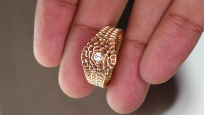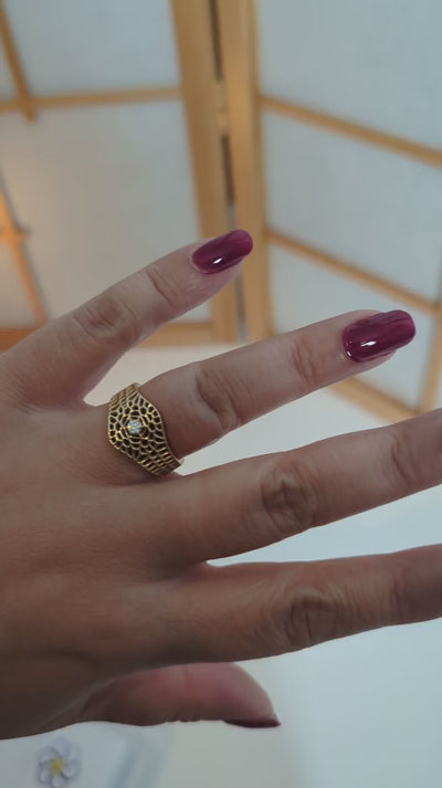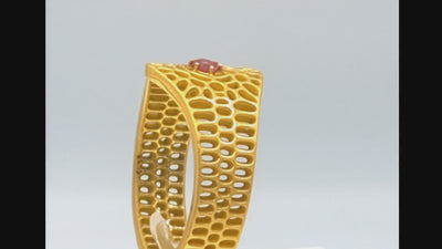 Make a statement with the Hive Ring, a bold and intricate cellular-structured design inspired by the natural geometry of honeycombs. Crafted in solid 14K or 18K gold, or platinum, this ring features a customizable center gemstone, making it a unique and personal statement piece.