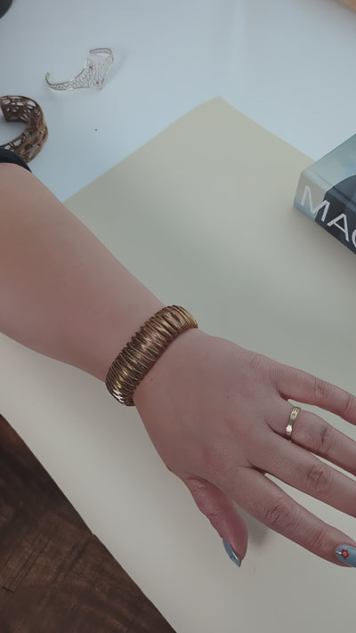 Inspired by Steve Reich and the Minimalist composer, this design features two spirals spinning out of phase, which gives it a dynamic touch and a textured appearance. The material shines with a warm golden hue, giving it a luxurious and elegant feel. It comes in a variety of materials, including bronze, gold-plated brass, and sterling silver. It is adjustable, and comfortable to wear all day at the office. It makes an excellent anniversary, birthday, or holiday gift.
