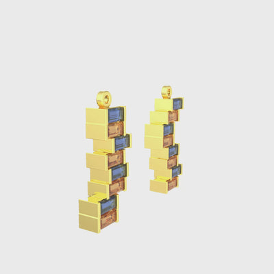 These earrings are an offering to the people of Ukraine to show support for the defense of their homeland. They feature 32 stones, 5mm x 2.5 mm, half citrine, half sapphire, double-sided, representing the Ukrainian flag. The they are designed using a white noise "jitter" algorithm, similar to the Jitter Ring. With baguettes that were popular in the Jazz Age, but with random white noise, it is a cross between Art-Deco and Cyberpunk. They are a pair with the Slava Ukraini ring, also in the jitter style. This is an excellent way to symbolize your support for Ukraine and also to support Ukraine: half the profit of the earrings will go to United 24, to help Ukraine rebuild.